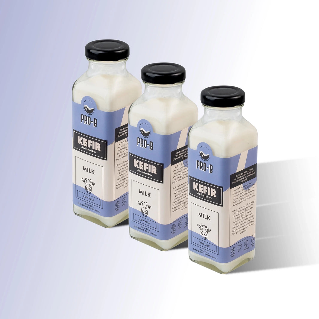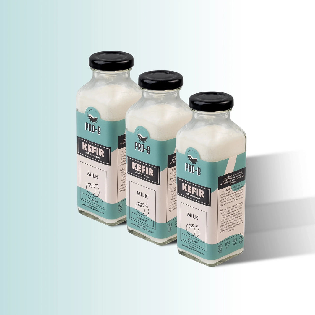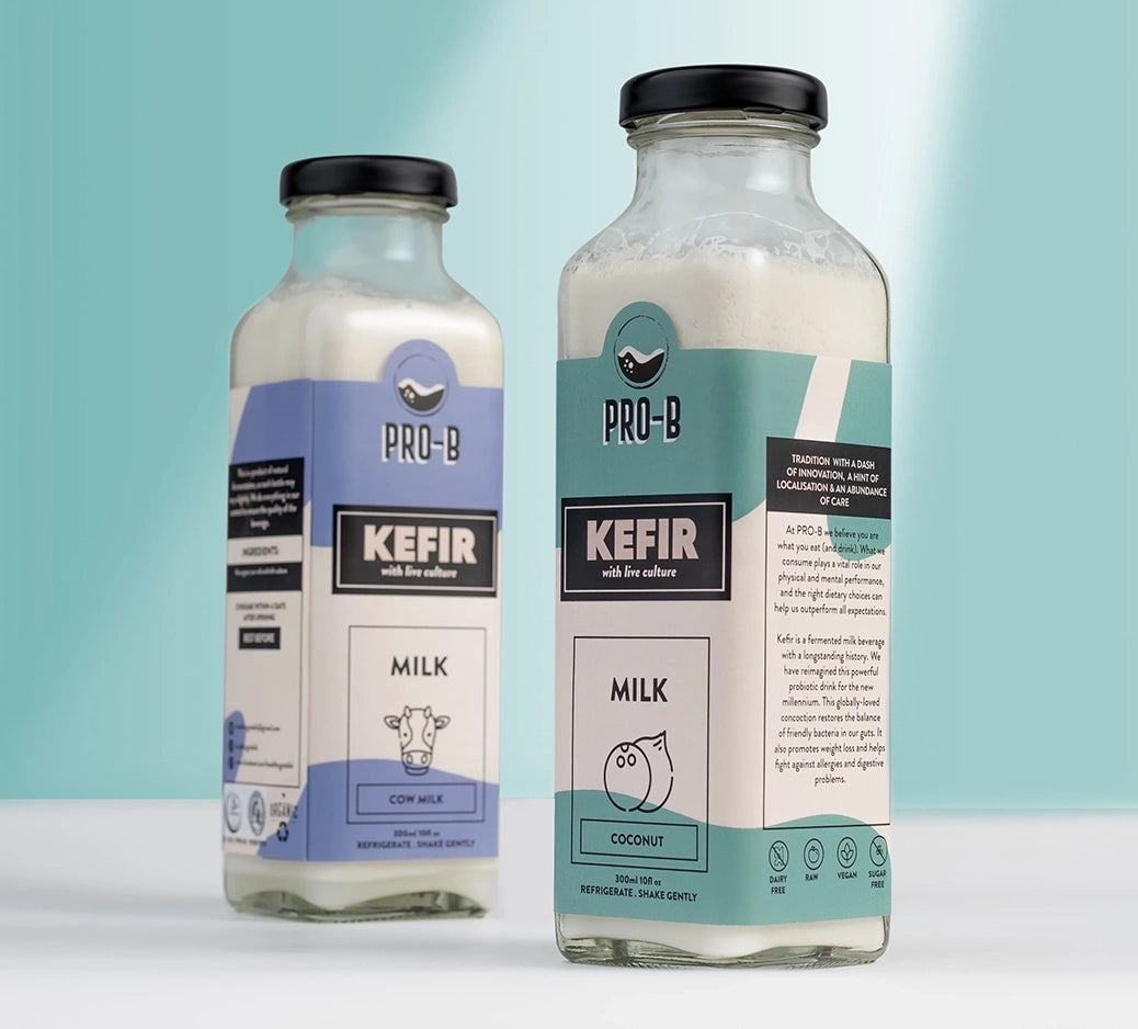 PRO-B milk kefir comes in two variations, cow milk and coconut milk, both of them are unexpectedly amazing for the gut. Milk contains more pro biotic strains than regular and greek yogurt.